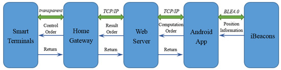 In this section, the structure of the system and how the system works will be illustrated. This system connects an Android App to terminal devices via the web server and home gateway. Moreover, with the help of RSSI fingerprint matching and the PDR algorithm, users can choose and conveniently and precisely control the devices using a mobile phone. The following is the working principle of this system: as is shown in Figure 1, the proposed system has five main parts: smart terminals, home gateway, web server, Android app and iBeacons. The implementation of the system can be divided into the following six steps: