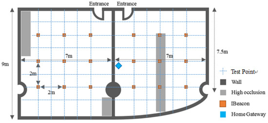 Experiments were conducted at the Laboratory of Science and Technology of Bell Honor School, Nanjing University of Posts and Telecommunications. We selected two rooms with a representative indoor layout for system installation (the process and environment of the installation will be illustrated in detail below). By representativeness we mean that the indoor environment is similar to the general home indoor layout. The top view of the laboratory is shown in Figure 5. The user in the experiment uses a mobile phone with normal an Android system. Terminal devices are installed on the electric devices, such as the access control, lights, and air conditionings. Also, it should be pointed out that this experiment was carried out under the condition that the terminal devices were stationary. Several common use cases encountered during daily life activities were simulated.