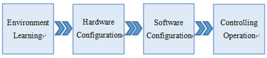 Figure 6 shows the whole process of the system installation and test. Firstly, environment learning should be conducted. The opened iBeacons are installed on the vertices of the 2 × 2 square array with border length of 2 m on the ceiling of the two rooms. The RSSI values of all the 18 iBeacons form a matrix. The value of each iBeacon is collected 400 times and the average is put into the fingerprint matching database for the web server to use. Secondly, the hardware setup contains two steps: (a) Connect the terminal devices to the electric devices that need to be controlled; (b) Supply power to the home gateway. If the LED on the gateway is blinking, it indicates that the startup is normal. Thirdly, the software setup includes web server startup and mobile device configuration. Mobile device configuration needs to install the app on the mobile phone firstly. Then, we open the app and input the coordinate position of the iBeacons and terminal devices to establish a coordinate system. Geomagnetic correction is then conducted to reduce the error between the geomagnetic coordinate and the iBeacon coordinates.