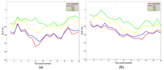 As shown in Figure 5, we set the area of the home on the left side to Area A and the area on the right side to Area B. Figure 7 shows the absolute location errors (ALE) of Area A and Area B, which were measured while the user remained stationary. It can be seen that there are differences in the curve of the same method between A and B, which is due to the heterogeneity of the experiment. The location error of the proposed method in this paper is smallest. The average error of Area A was 0.8 m, and the average error of B was 0.832 m. The method with biggest error is the PDR, which is mainly due to the cumulative effect of additive errors. Compared with BLS and FLS, the method of this system reduced the average error by 11% and 12%.