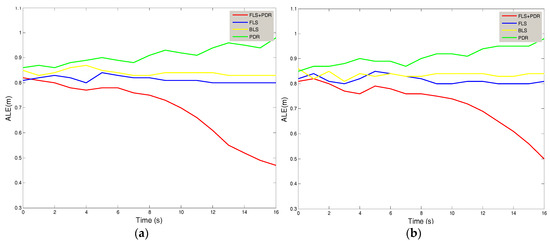 Figure 9 shows the relationship between the absolute location errors (ALE) of the Area A and Area B and the time while the user remained stationary. It can be seen that in the model proposed in this paper, the improved effect of PDR technology on FLS becomes more pronounced over time. If the user keeps stationary for 5 min, the error of this model will decrease by 2%; if the user keeps stationary for 15 min, the error of this model will decrease by 31%.