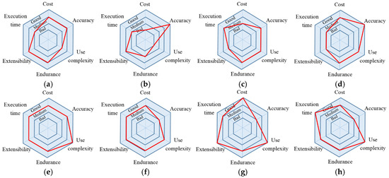Though there are many indoor location solutions, each of them has its own advantages and corresponding application scenarios. Combining these solutions and the location methods compared in the previous part, a group of charts are displayed in Figure 10 to compare all the solutions intuitively. The larger the diameter of the red circle, the better the performance of the system. For example, though the Activity Recognition and Semantic Description (AR + SD) proposed by [25] for indoor location has great accuracy, the system requirements are high and the use operations are complex compared with the solution in this paper.
