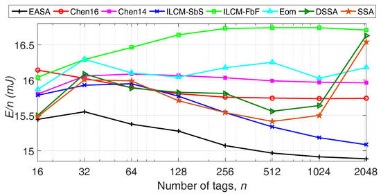EASA presents the lowest E/n when 1/ ≥ 2.66. Therefore, there is evidence that EASA presents an energy-aware frame. Furthermore, the higher the value of 1/, the more notable the improvement in E/n of the proposed protocol in relation to the rest of the strategies. This occurs because the frame size of EASA increases with increasing 1/ (see (20)), decreasing the probability of collisions. As 1/ decreases, the performance of EASA deteriorates. In this situation, the probability of collision in EASA is higher than in the previous situation (L is smaller for the same n). As a result, the reader consumes a higher amount of transmitting and receiving power and , increasing the overall E/n of EASA.