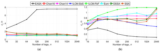 Recovering the results obtained in Figure 2, it is noticed that the reduction in the number of collision slots per tag of EASA results in a lower . That is, the increase in the number of idle slots is compensated with a decrease in the number of collision slots.
