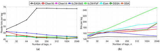 Next, the total number of reader transmitted bits per tag and the average number of bits transmitted by one tag are evaluated, because these metrics also influence . Results are shown in Figure 4a,b.