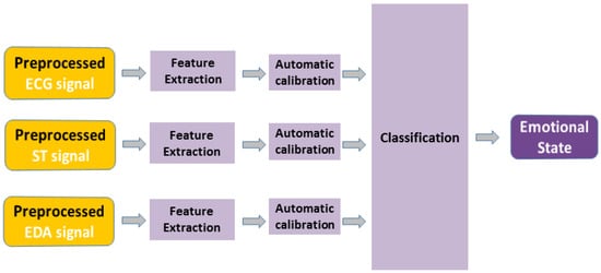 In this work, we are proposing a universal robust emotion recognition system, which should perform well in environments that are different from the ones of its initial training (i.e., different subjects, different elicitation instruments/contexts, and different physiological sensors brands). The most well-known features in the literature are extracted from three physiological signals—EDA, ECG and Skin temperature—in order to classify the emotional states of different subjects. More details about the features extraction are presented in the Section 4.3.