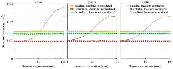 Standard deviation of the acceleration estimation errors, with respect to the distance between the IMUs.