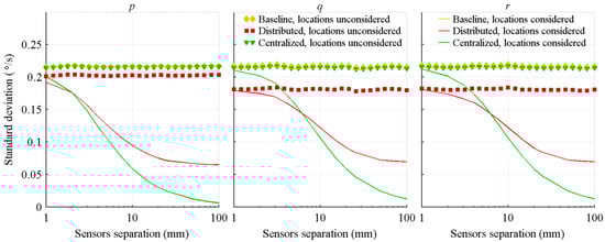 Standard deviation of the attitude rate estimation errors, with respect to the distance between the IMUs.