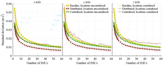 Standard deviation of the acceleration estimation errors, with respect to the number of IMUs.