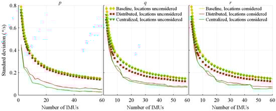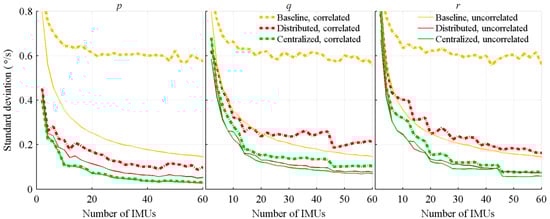 Standard deviation of the attitude rate estimation errors, with respect to the number of IMUs.