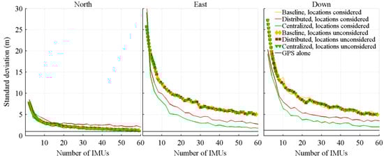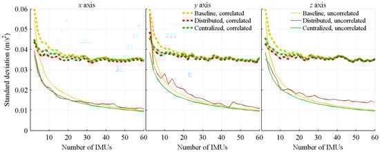 As expected, a trend coherent with the signal averaging theory, a diminution of the standard deviation proportional to , is obtained for all cases. For the algorithms not considering sensors location, the distributed architecture provides the best performance. Because of the local filtering, the mean of the master filter is computed on data having a smaller standard deviation than the raw measurements, resulting in a less noisy final estimation for the distributed architecture than for the baseline architecture. On its part, because of the covariance matrices tuning which gives equal weight to all measurements, the centralized architecture is, when the sensors location is not considered, similar to directly computing the mean of the measurements. The small performance improvement, in comparison to the baseline architecture, comes from the a priori knowledge of the trajectory and noises introduced into the Kalman filter. The two Kalman filterbased architectures, therefore, use the redundancy differently: the centralized one improves the biases estimation (Section 4.3), while the distributed one improves the parameter estimations.