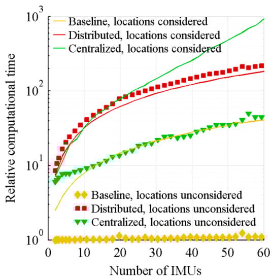 For the centralized architecture, the computational time is driven by the inversion of the Kalman filter covariance matrix. When the sensors location is considered, the addition of an IMU adds six rows and six columns to the matrix to be inverted. However, when the sensors location is not considered, it rather adds one row and one column to each of the six covariance matrices. For a relatively small symmetric matrix, the inversion is quickly performed. Therefore, among the algorithms not considering sensors location, the centralized architecture, which requires less handling operations, is faster than the distributed one. However, for large matrix, typical of the centralized architecture with its algorithm considering sensors location, the computational time is much longer.