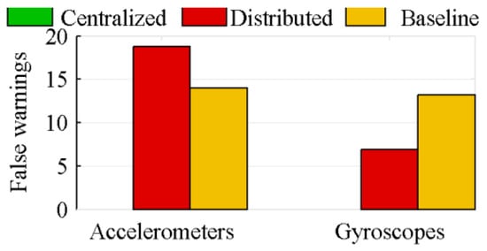 The bias estimation also explains why there are more false warnings for the accelerometers than for the gyroscopes. Because of the fictitious forces, the measured acceleration magnitude is much larger than the measured attitude rate one. The distributed architecture has difficulty to estimate the sensors bias in presence large measured values (Section 4.3).