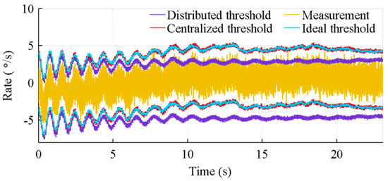 Because of its inability to correctly estimate the sensors bias, the distributed architecture generates a lot of false warnings, while the centralized architecture correctly identifies nearly all faulty sensors. The effect of this poor biases estimation is shown in Figure 12. This figure presents the 4σ thresholds of the centralized and distributed architectures over the measurements of a healthy sensor, when 27 IMUs are used. Because of its drift, at 8.9 s, this healthy sensor is considered faulty by the distributed architecture. The ideal threshold, added to the graphic, is the threshold computed on the nominal biased value. The latter is the measured value without noise.