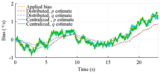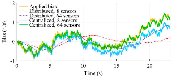 Figure 15 illustrates the difficulty of the distributed architecture, due to the a priori knowledge of the trajectory (sensor movements) introduced into the Kalman filter state noise covariance matrix, to estimate the sensors bias when the expected measurement variation is large. In this figure, the same bias is applied on gyroscopes measuring (large value) and (small value). This figure shows that the centralized architecture bias estimation is marginally affected by the amplitude of the measurements, while the distributed architecture one is significantly better for .