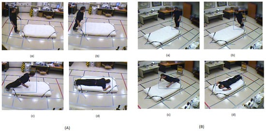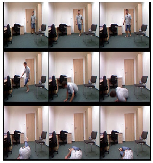 The UR Fall Detection (URFD) dataset contains frontal and overhead video sequences obtained by two Kinect sensors, with one placed at the height of 1 m from the floor and the other mounted on the ceiling with a height of 3 m. The dataset contains two kinds of falls that were performed by five people—from standing position and from sitting on the chair. The dataset was recorded at 30 frames per second. The frontal sequence contains 314 frames, in which 74 frames contain falls and 240 frames have no falls. The key frames of the URFD dataset are shown in Figure 3. The overhead sequence contains a total of 302 frames, in which 75 frames contain falls, while 227 have no falls.