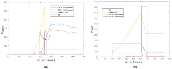 The temporal variation in body speed (B.S.), upper half area of the bounding box (U.H.B.B), and x-component and y-component of the geometric centre (G.C.) of a falling person on the MCF dataset: (a) camera 2, video 2; (b) camera 3, video 3.