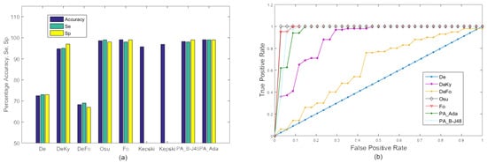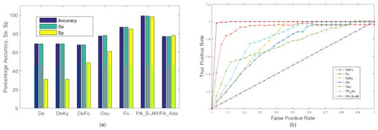 Experiments on the URFD dataset: comparison of accuracy, Se and Sp between the existing approaches under consideration and the proposed approach on the frontal and overhead data sequence from the URFD dataset. (a) Graph; (b) ROC curve.