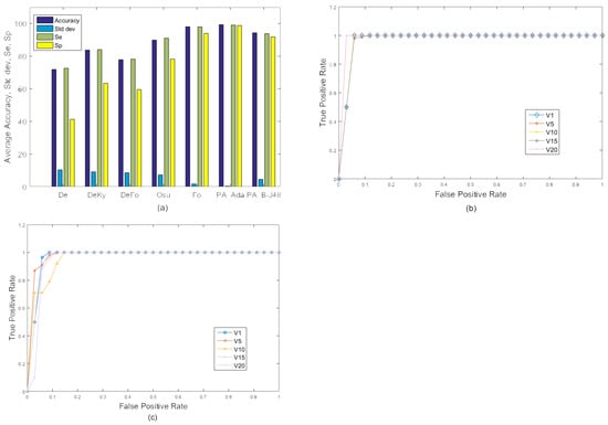Experiment 2: Average comparison of the existing approaches and the proposed approaches on the MCF dataset with 10-fold cross validation using two categories: ‘Fall’ and ‘No Fall’. (a) Graph; (b,c) ROC curve of selected videos (videos 1, 6, 10, 15, and 20) using camera 2 for the proposed approaches, PA_B-J48 and PA_Ada.