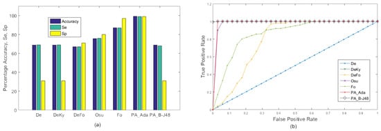 Experiment 3: Accuracy comparison of the existing approaches, De, DeKy, DeFo, Osu, Ky, Fo and the proposed approaches, ’PA_B-J48’ and ’PA_Ada’, on all videos in the MCF dataset with 10-fold cross validation using three classes i.e., ‘fall’, ‘sitting’ and ‘no fall’. (a) Graph; (b) ROC curve.