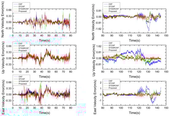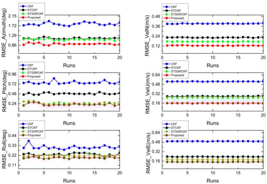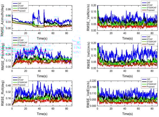 In order to compare the overall performance of the four methods and intuitively illustrate the effectiveness of the proposed filter for low-cost GPS/INS integration, the root mean square error (RMSE) of the velocity and attitude that averaged across all time instances is used as a comparison metric, which are defined as follows: