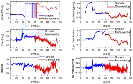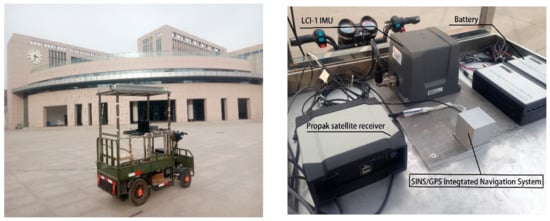 where , the subscripts (GPS and ins) represent the velocity and geographical position obtained from GPS and INS, respectively. is the observation matrix. is the white Gaussian measurement noise with zero mean and covariance = diag([0.05 m/s, 0.05 m/s, 0.05 m/s, 1 m, 3 m, 1 m])2, which is determined from the GPS’s stochastic measurement error.