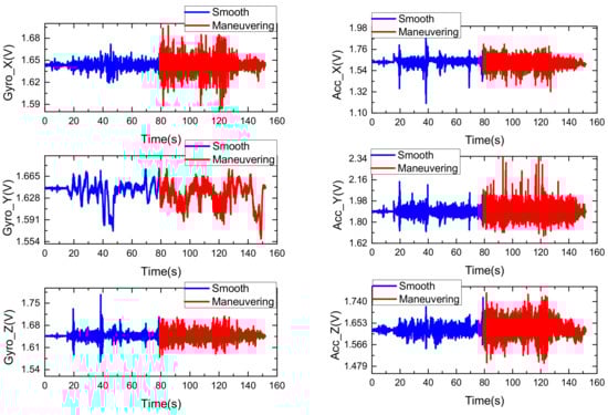 The original outputs of the tri-axis gyroscope (left) and accelerometer (right).