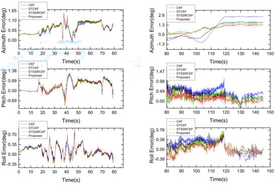 The velocity and attitude error obtained from the four filtering algorithms when M = 10 are respectively shown in Figure 7 and Figure 8. Owing to the fact that the position error estimation is mainly determined by the measurement noise matrix R and is not sensitive to the time-varying process noise, it is unable to reflect the true performance of the four different filters in the maneuvering stage. For this reason, we do not present the result of the position error here. It can be seen from Figure 7 and Figure 8 that, in the smooth moving stage during intervals 0–79 s, the proposed method performs quite similar with the existing filters. The results are not surprising, this is because that in this case the Gaussian assumption for the statistical value of process noise can be satisfied. While for the maneuvering stage in the intervals of 80–152 s, the proposed IST-7thSSRCKF and the existing strong tracking based filters such as ST-CKF and ST-SSRCKF, exhibit smaller navigation error than the traditional CKF. This is because that in the maneuvering stage the Gaussian assumption of process noise is violated and the statistical value of process noise is changed due to the influence of the vehicle’s severe maneuvers, which results in a much degraded performance of CKF. In contrast, the severe vehicle maneuverability can be tracked appropriately by the ST-CKF, ST-SSRCKF and IST-7thSSRCKF as shown in Figure 7 and Figure 8. The performance improvement is mainly due to the strong tracking technique used in these filters, since the time-varying process uncertainty can be better suppressed by introducing the time-variant suboptimal fading factor matrix to the state prediction covariance matrix to maintain the residual sequence orthogonal. Furthermore, we can also see that the IST-7thSSRCKF outperforms the ST-CKF and ST-SSRCKF, which indicates that the 7th-degree SSR rule is more accurate in computing the multi-dimensional integrals than the SR and SSR rules. However, the accuracy improvement is at the cost of slightly larger computational burden as shown in Table 3. The reason is that the computation time is approximately proportional to the number of points used in these filters. The number of points required in the IST-7thSSRCKF is 4510, which is greater than that of CKF, STCKF and ST-SSRCKF, which are being 42, 42 and 44, respectively. In this respect, the implementation time of the proposed method is almost 100 times of CKF, STCKF and ST-SSRCKF. Actually, for the GPS/INS integrated navigation system with high performance navigation computer, the large computational burden can be afforded. Thereby, the proposed IST-7thSSRCKF is a better choice to deal with process uncertainty in terms of estimation accuracy when comparing with the investigated other three methods.