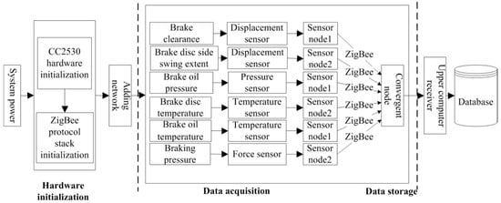 The perception layer is responsible for data collection, wireless data transmission over short distances, reception, display, and data preservation. Based on ZigBee technology [21,22], we used SoC CC2530 as the core module of the sensor nodes and the converging nodes. Based on the data types and characteristics, the connections of different sensors and core modules were designed to obtain the corresponding sensor nodes. The ZigBee standard transmission protocol was selected to establish a star network topology. A line data acquisition system was employed to collect operational data [23,24,25]. Taking the hoist brake system as an example, the structure of the perception layer in the hoist fault diagnosis system based on the IoT is shown in Figure 3.