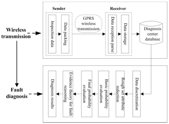 As a bridge to the IoT, the network layer provides technical support for long-distance remote monitoring, diagnosis, manipulation, and other data-supporting work. The network layer is mainly divided into two parts: one part manages long-distance wireless transmission, and the other performs data fault diagnosis. At the transmitter, data are transferred from the database wirelessly in the form of a package using a GPRS module over a mobile network. The receiving end parses and saves the data to the remote diagnostic center database. Based on rough set theory, a knowledge acquisition model of fault diagnosis rules was constructed for the hoister. First, the historical diagnosis dataset and domain experience knowledge were discretized. Then, the decision table was constructed, and the diagnosis rules were reduced. Thus, the resulting high-confidence diagnosis rules were stored in the knowledge library. Next, we used DSmT evidence theory to perform fault reasoning and to finally obtain the fault diagnosis result. The structure of the network layer is shown in Figure 4.