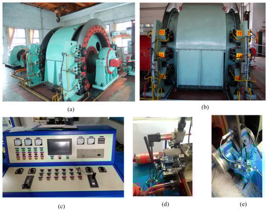 Field diagram of test equipment. (a) Main shaft device of a hoist; (b) brake device; (c) operating table; (d) wireless acquisition of the pressure signal in a hydraulic station; and (e) wireless acquisition of brake disc space.