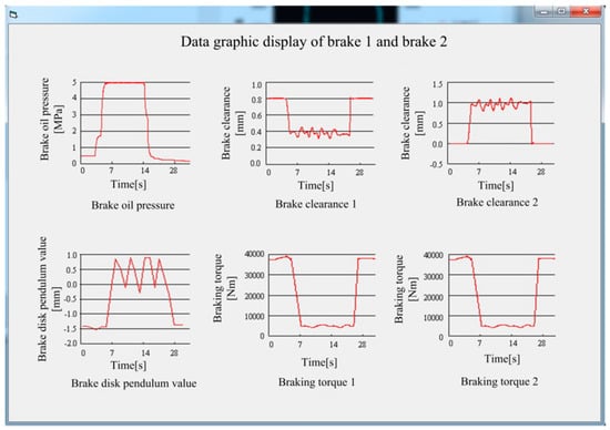 The braking system was used as the experimental research object. The hoist uses four pairs of eight-disc brakes for braking. By installing the sensors above brakes 1 and 2, we obtained 15 data points per second, and the obtained results are shown graphically on the interface in Figure 7.