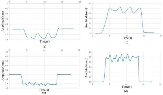 From the specific changes in Figure 8 in (a) and (b), and (c) and (d), the general changes in the patterns in (b), (d), (a), and (c) are consistent, indicating that the collected data were roughly the same. The amplitude of the graphics is visible, and especially in (b) and (d), the amplitude of the graphics are clearer. The data acquisition is more accurate and more valuable for the important parameter of brake shoe clearance. In sum, the results of this system are not only consistent with those obtained using the traditional method, but they are also more accurate, clear, and practical.