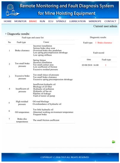 The application layer was mainly used for fault release. Taking the “gap is too large” fault as an example, the application layer fault release is shown in Figure 9. The diagnosis results show 1, and the diagnosis result is fault 1. Compared to the type of fault, the brake shoe gap fault and the corresponding causes of fault and maintenance suggestions can be found one at a time.