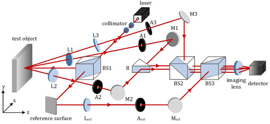 The optical configuration of the proposed four-beam ESPI system for online measurement of full-field 3D displacement is illustrated in Figure 1. The expanded and collimated laser beam is firstly split into two paths by the beam splitter . The reflected one illuminates the test object with optically rough surface perpendicularly, while the transmitted one strikes the reference surface. The light scattered diffusely from the test object, denoted as object beam, is observed from three different directions. Each object beam goes successively through the respective lens (, or ) and single aperture (, or ). After that, they are reflected by the plane mirrors (, and ), reflector R, and beam splitter . At the same time, the light scattered from the reference surface, denoted as reference beam, passes through and , reflected by , and meets three object beams at . After travelling through the imaging lens, these four beams generate the interferometric speckle patterns at the imaging array of the detector.