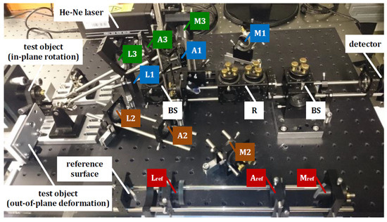 Due to the increased manufacturing demand for advanced materials and applications, especially in the industries of robotics, automotive, and aerospace, the technology for online measuring nondestructive full-field three-dimensional (3D) displacement is gradually becoming of great interest [1,2]. Since the 1970s, various optical approaches have been proposed. Two of the most common methods are digital image correlation (DIC) or digital speckle photography (DSP) extended through stereovision [3,4,5], and electronic speckle pattern interferometry (ESPI) with different sensitivity vectors [6,7,8,9,10]. The former techniques, which require a multi-camera system, identify the position of each object point in two frames and subsequently the relative displacement by applying a correlation algorithm to stochastic intensity patterns on the object’s surface [11,12]. The vision-based sensors with multiple cameras belong to this technique [13,14,15,16,17]. They use a full projection matrix as the transformation metric to measure the 3D structural displacement. The computer vision-based sensors have various industrial applications—for example, to control and check visual appearance in the production process, to monitor static and dynamic displacements of civil engineering structures, to assess the quantitative structural integrity, to monitor low- and high-frequency vibration of engineering structures, and to measure surface traction fields to represent the magnitude and direction of force applied to the skin’s surface, etc. However, this method can be challenging under the conditions of small depth of field or limited accessibility for detectors, etc. [18,19]. Moreover, the displacements to be measured are photographically resolved [20]. On the other hand, with the help of phase-shifting techniques in ESPI, the measurement results at nanoscale resolution can be obtained by building the relationship between the displacement and the phase change distribution caused by the interference between the object wave and reference wave [21]. To introduce different sensitivity vectors, an interferometric configuration with multiple illuminations and single detector is widely used. In this case, an online measurement can be realized by using spatial phase-shifting technique, together with, for example, the manipulation of the coherency of object and reference beams [22], or the control of the beams’ polarization [23], or the introduction of a multi-wavelength laser [24]. In addition, the ESPI systems with single illumination and multiple detectors for dynamic 3D displacement measurement have also been proposed [25,26], which, however, require a complex and elaborate calibration process. An important extension to ESPI applicability is provided by the single-shot and multiplexing measurement techniques, which, however, require complex calibration processes [27,28,29,30,31,32,33]. In year 2001, Hack et al. presented the process of validating a 3D finite element analysis by speckle interferometry using a wavelength-division multiplexing technique. It was advisable for the calibration procedure to make comparative measurements on the test object itself on selected locations [34]. Three years later, Coggrave et al. proposed a real-time interferometry system to visualize the deformation fields. A calibration process based on the minimization of a function obtained from a sequence of interferometric images was used [35]. In year 2014, Bergström et al. proposed the single-shot dual-wavelength digital holography for shape evaluation [36], whose calibration method was presented by Khodadad et al. [37,38]. In year 2015, Khaleghi et al. introduced the multiplexed holography for a single-shot three-dimensional shape and displacement measurements. A special registration algorithm is developed to minimize the differences between each two sensitivity vectors [39].