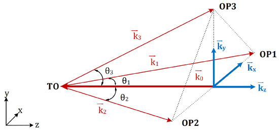 To describe the four-beam ESPI system clearly, the wave vectors are introduced. As shown in Figure 3, denotes the wave vector of the incidence beam on the test object, while , and are wave vectors of the respective object beam. lies parallel to the object’s surface normal and points along the negative z-axis. and are located in the -plane and are on different sides with respect to the incidence beam at angles of and . is in -plane with angle to the incidence beam.
