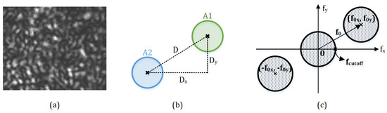 This single-aperture based phase modulation technique generates a periodic spatial fringe structure within each speckle grain, as shown in Figure 4a, to introduce a spatial carrier frequency , where f represents the focus length of the imaging lens; D denotes the relative position and distance between the virtual images of the corresponding apertures in the detector’s plane. It is to be noted that the fringes within the speckle grains are perpendicular to the line joining the centers of two virtual apertures. Thus, by altering the orientation of the aperture pair, one can change the fringe direction over the image, and consequently adjust the direction of the carrier frequency. In addition, the aperture opening size is also an important parameter that is proportional to the spatial resolution and the cutoff frequency of the speckle image, i.e., . Figure 4b shows an arbitrarily relative position of the virtual images of two single apertures in the plane of the detector. They are laterally displaced from each other for . The carrier fringes within the internally modulated speckle result in the carrier frequency directing along the joining line, and the carrier frequency components and are proportional to and , respectively. The resultant spectrum of the interference speckle pattern on the detector is illustrated in Figure 4c. The spectrum pair contains the information of the interferogram, while the origin-located spectrum represents the low-frequency components of the speckle image, including the background intensity and noise. A more detailed description about this spatial carrier phase-shifting technique is demonstrated in [42].