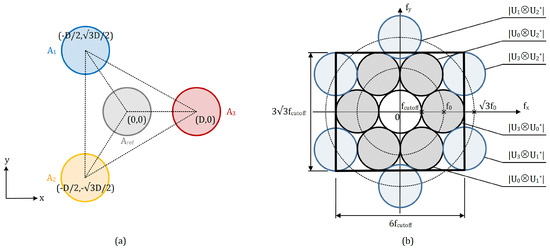 Based on the requirements above, the relative positions among the virtual images of the four single apertures in the system are set, as shown in Figure 5a: the virtual aperture in the reference beam is located in the middle with coordinate ; three virtual apertures , and in the object beams are laterally displaced from with the same distance D but at different angles of , and with respect to the x-axis, respectively. Thus, their corresponding coordinates are , , and . The centers of these three beams set up an equilateral triangle with side length of . The resultant spectrum distribution of the internally modulated four-beam speckle interferogram is shown in Figure 5b.