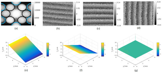 Analogously, the phase distributions before and after object’s motion ( and ) can be obtained. Then, the phase change distribution can be calculated by . Subsequently, the three orthogonal displacement components , and can be evaluated by using Equation (6). Obviously, in the whole data processing procedures, only two interferograms under different loading events are required, which enables online measurement of the 3D displacement.