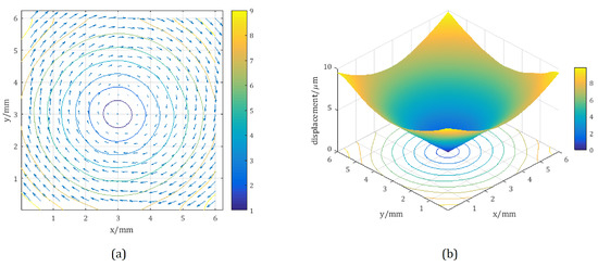 The last step was to calculate the absolute value of the three-dimensional displacement caused by the in-plane rotation. As shown in Figure 7, the contours of the absolute displacement are essentially a set of concentric circles around the rotation center. The synthetic in-plane displacements vectors of and are shown in Figure 7a. The vectors are parallel to the tangential directions of the corresponding displacement contours and depict the rotation in the clockwise direction. Numerically, the absolute values of the vectors increase linearly along the radial direction.