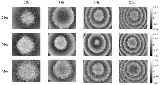 The wrapped change maps from top to bottom represent , and in turn, while, from left to right, they are displayed along the time-axis, i.e., in different time frames at 0.5 s, 1.0 s, 1.5 s, and 2.0 s, respectively. It is well known that, in the case of a pure out-of-plane displacement measurement, the resultant wrapped phase change maps are concentric circles around the loading point, generally the same as the measured wrapped phase change maps. This is because the out-of-plane displacement component , which is contained in , and , is significantly more dominant than the other two in-plane displacement components and in this case.