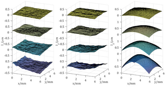 The results are shown in Figure 9. With the increase of the loading force, all three of the displacement components increase gradually. Compared to the simulation model of central deformation, the relative measurement error of is . As discussed above, the out-of-plane component depicts mainly the deformed object’s surface. Since the deformation center can be observed, the in-plane components and are of opposite signs with respect to the lines, which go through the deformation center and are parallel to the y- and x-axis, respectively.