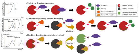 Scheme of enzymatic biosensor for substrate and inhibitor (reversible and irreversible) detection.