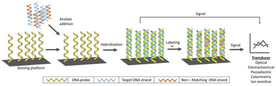 The principle of these widely used sensors lies in the hybridization process through spontaneous hydrogen bonding between the target DNA and its complementary strand. This principle is usually utilized by immobilizing the single-stranded DNA (ssDNA) onto a suitable surface [38]. The hybridization event is generally detected by two different methods; (i) the detection of certain electroactive indicator (labeling) (ii) the detection of signal produced by the most electroactive base of DNA [39] as depicted in Figure 2.