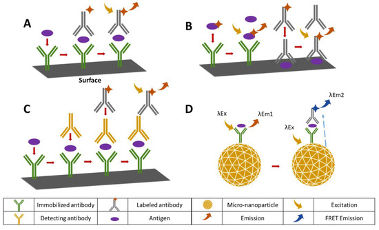 Possible immunoassay binding configurations: (A) sandwich structure formation (B) competitive style immunoassays (C) extended sandwich structure formation (D) sandwich structure formation on a (micro-nanoparticle) surface.