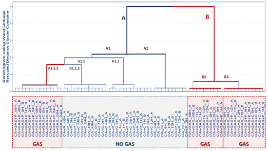 As can be seen from the dendrogram, fire debris samples are divided into two major clusters—A and B. Cluster A is widely distributed into further subclusters, mostly composed of samples without gasoline. The exception is subcluster A1.1.1, which is formed mainly by samples with gasoline with one of the FSAs (i.e., Cafoam). This subcluster contains 14 out of the total 36 fire debris samples with gasoline and includes 12 out of the 24 burned samples with gasoline and the FSA. Cluster B contains all samples burned with gasoline without FSA (except for those samples with 24 h of weathering, which are included in subcluster A1.1.) and the remaining burned samples with gasoline that also contain Powder or Cafoam. Inspection of the dendrogram suggests that the data from the HS-MS eNose are mainly related to those compounds responsible for the discrimination of the fire debris regarding the use of gasoline, since all of the subclusters include samples with and without gasoline together. However, subcluster A1.1.1, which mainly includes samples with gasoline and FSA, is joined at a shorter distance to subcluster A1.1.2, which includes burned samples without gasoline but including Cafoam or Powder. A trend related to the sampling time was not observed. Therefore, these results suggest that the data from the HS-MS eNose are mainly related to those compounds responsible firstly for the discrimination of the fire debris regarding the use of gasoline and secondly according the type of FSA. A full classification of the samples according to the usage/non-usage of gasoline did not seem to be achieved due to the effect of using FSA.