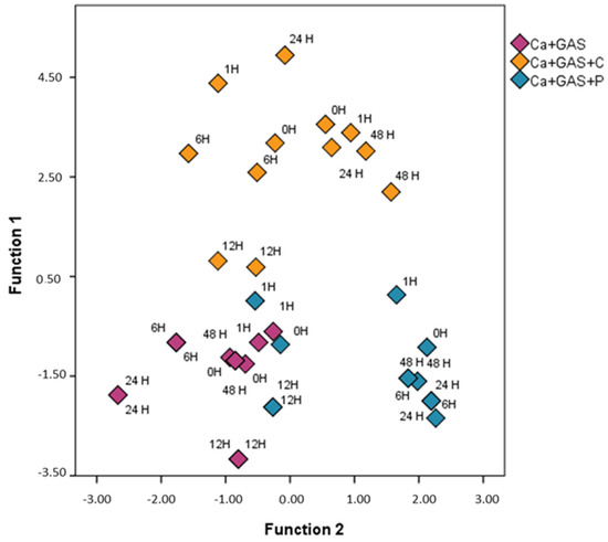 In order to investigate the effect of FSA in greater depth and to maximize the separation between known categories, a supervised chemometric technique, LDA, was applied solely to the dataset of fire debris samples with gasoline. The resulting data matrix was then D 36 × 156. In this case three groups (Ca + GAS, Ca + GAS + C and Ca + GAS + P) were established a priori. A stepwise method was applied in order to identify whether there were specific m/z values in the TIMS that were more significant than others when discriminating samples according to the use and type of FSA. From this LDA, two canonical discriminant functions that maximize the separation were obtained. The m/z values selected to develop the discriminant function were: m/z 51, m/z 60, m/z 67, m/z 87, m/z 166 and m/z 190. Since there is not a chromatographic separation, it cannot be guaranteed that the selected m/z could be related to the different FSAs and/or to other chemical reactions like pyrolysis o weathering processes. The magnitudes of the predictive effect are 0.82 and 0.52, with eigenvalues of 4.59 and 1.09, respectively. A total of 80.6% of cross-validated grouped cases were correctly classified. The territorial map obtained for all the samples burned with gasoline when plotting the first two Fisher’s discriminant functions are shown in Figure 2.