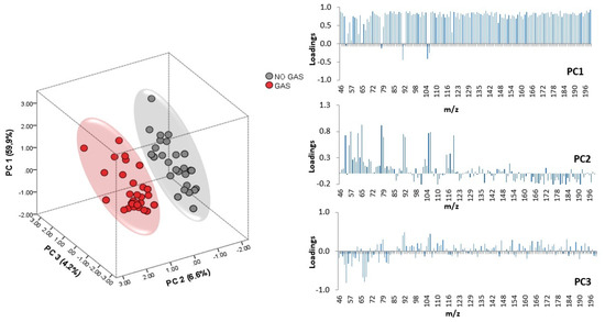 As can be observed, PC1, PC2 vs. PC3 allows a full separation of all the fire debris samples according to the presence/absence of gasoline. As illustrated in Figure 3, PC2 seems to be more related to the presence/absence of gasoline although PC1 accounts for a higher variance. The loading values are also displayed in Figure 3. It can be seen that almost all of the m/z values have a high influence on PC1, while only a few signals show high loadings (values above 0.7) in the case of PC2. Although the contribution of each m/z is different, the loadings on PC1 are remarkably similar; this is probably due to data normalization procedure.