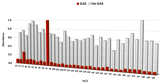 Based on these results, and with the aim of obtaining a full discrimination of the fire debris samples according to the presence/absence of gasoline, a repeated-analysis stepwise LDA was applied using the whole dataset without m/z intensities related to the use of the two FSAs (D 72 × 141). Leave-one-out cross-validation was again selected. The resulting discriminant function was able to discriminate successfully all of the samples according to the presence/absence of gasoline (100.0% of cross-validated grouped cases were correctly classified). According to the p-value (p = 0.000), groups will make predictions that are statistically significant in their accuracy. This indicates that the model is very stable and strong. When only intensity values of the signals (m/z) selected by the LDA to develop the Fisher linear discriminant functions are displayed, a different profile for burned samples with and without gasoline is obtained (Figure 4). All of the m/z values were normalized to the base peak at 100%.